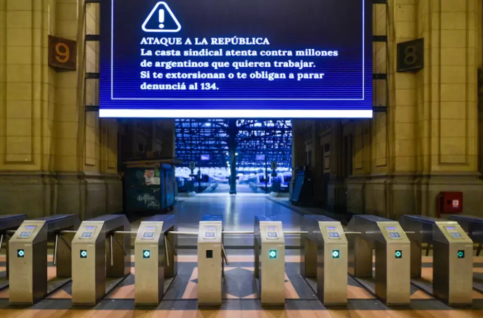 Horas antes del inicio del paro general de la CGT, el gobierno nacional difundió un mensaje de alerta en las pantallas y altoparlantes de las estaciones de trenes y colectivos. "Ataque a la República. La casta sindical atenta contra millones de argentinos que quieren trabajar. Si te extorsionan o te obligan a parar denuncia al 134", se puede leer en las terminales de Constitución o Retiro.