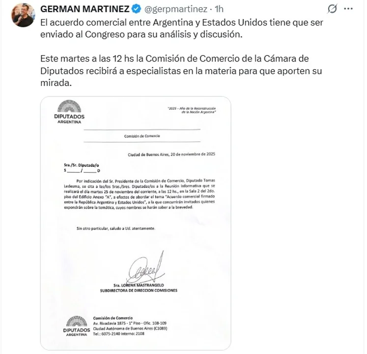 "Este martes a las 12 la Comisión de Comercio de la Cámara de Diputados recibirá a especialistas en la materia para que aporten su mirada", consignó Martínez.