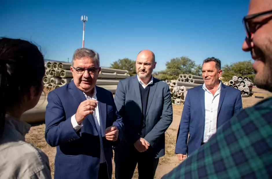 El gobernador Raúl Jalil, junto a los ministros de Agua, Energía y Medio Ambiente, Lucas Zampieri, y de Vivienda y Urbanización, Fidel Saenz, y el vicepresidente de Aguas de Catamarca Sapem, Leopoldo Marchetti, recorrieron y observaron en el CAPE el acopio de caños y materiales para la ejecución de la tercera etapa de la obra Acueducto Norte y otras obras de agua que se desarrollan en el Valle Central.