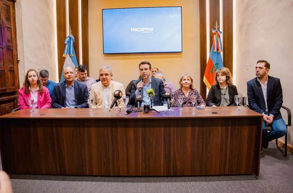 El gobernador Raúl Jalil, acompañado de los ministros de Gobierno, Seguridad y Justicia, Fernando Monguillot; de Trabajo, Planificación y Recursos Humanos, Verónica Soria, y de Integración Regional, Logística y Transporte, Eduardo Andrada, confirmó el otorgamiento de una bonificación especial de $120.000 destinada a todos los trabajadores de la Administración Pública Provincial, incluyendo al personal de salud, seguridad y educación de gestión pública y privada de toda la provincia.
