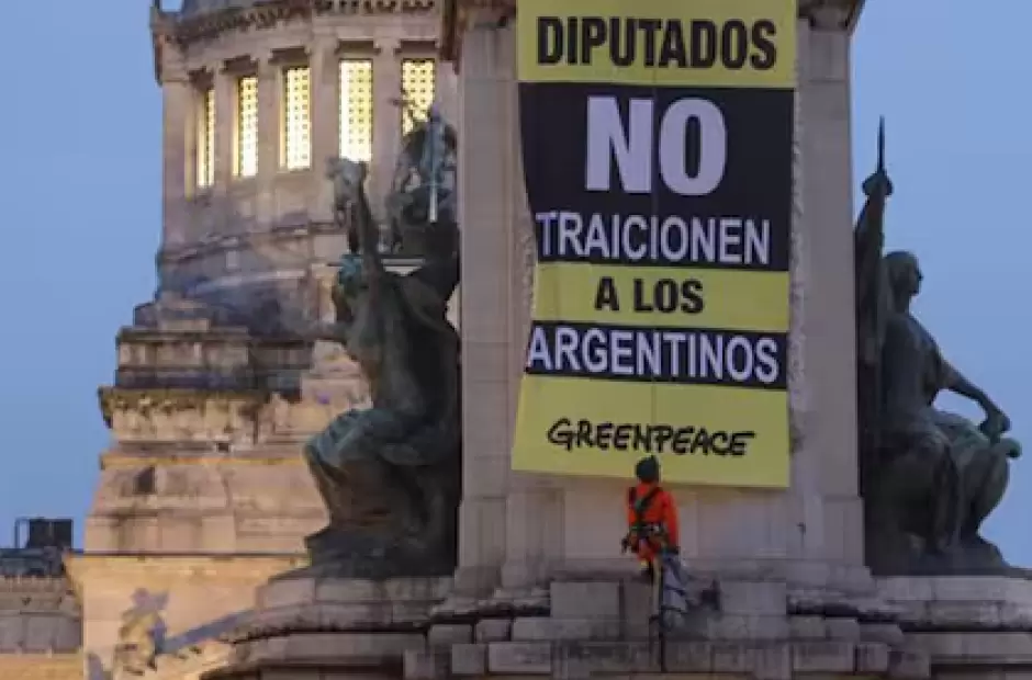 La acción fue protagonizada por un grupo de activistas de Greenpeace, que se trepó al Monumento de los Dos Congresos, ubicado frente al Palacio Legislativo, con el objetivo de visibilizar el rechazo al proyecto impulsado por el Gobierno de Javier Milei, que busca habilitar la actividad minera en zonas actualmente protegidas.
