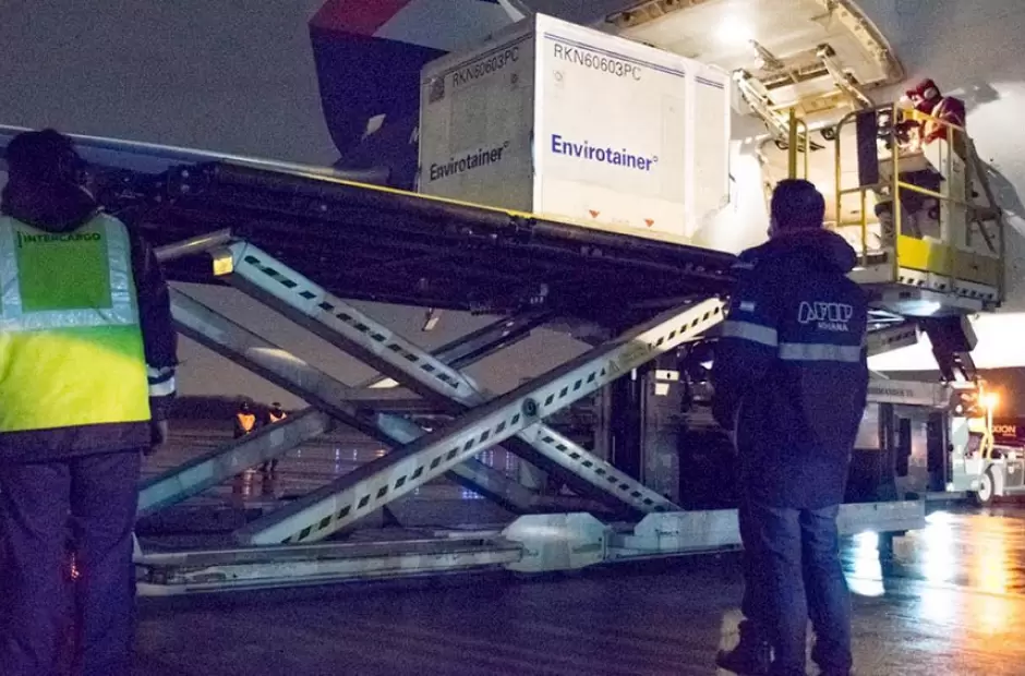 El Boeing 767-300 de la empresa Latam Cargo Colombia, con el número de vuelo UC1101, aterrizó a las 18.57 en el aeropuerto internacional de Ezeiza con 1.349.700 dosis del suero desarrollado en conjunto por la Universidad de Oxford y el laboratorio AstraZeneca, y cuyo componente activo se produce en el país.