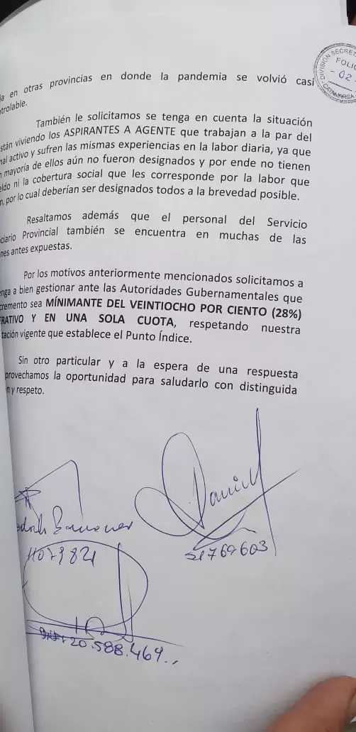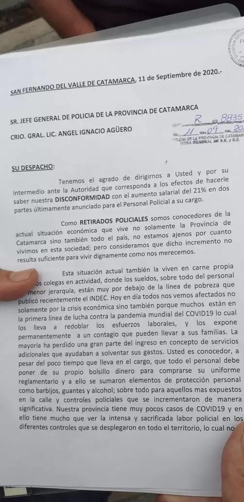 Luego de la movilización de esta mañana hacia Casa de Gobierno llevada a cabo por un grupo de policías, efectivos retirados de la fuerza enviaron un petitorio al jefe de Policía, Ángel Agüero, donde plantean su descontento ante lo que consideraron un insuficiente aumento conseguido para el sector.