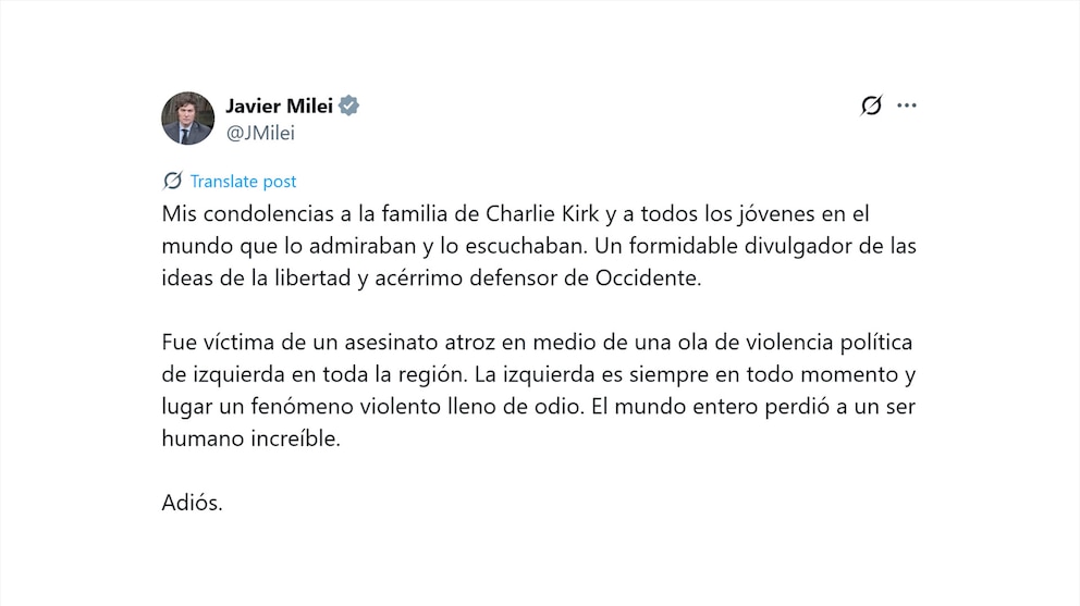"Mis condolencias a la familia de Charlie Kirk y a todos los jóvenes en el mundo que lo admiraban y lo escuchaban. Un formidable divulgador de las ideas de la libertad y acérrimo defensor de Occidente", escribió Milei en X.