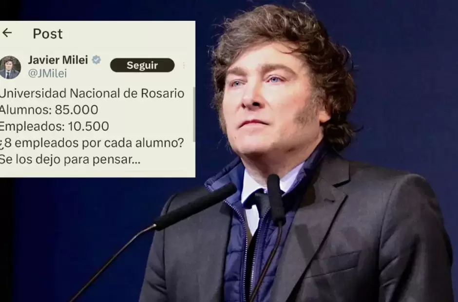 El Presidente Javier Milei publicó un tuit en el que retoma una entrevista en la que el rector de la Universidad Nacional de Rosario (UNR), Franco Bartolacci, indicó que la institución cuenta con 85.000 alumnos y 10.500 empleados. En la publicación, Milei interroga "¿8 empleados por cada alumno? Se los dejo para pensar...", cuando el cálculo correcto es 1 empleado cada 8 alumnos.