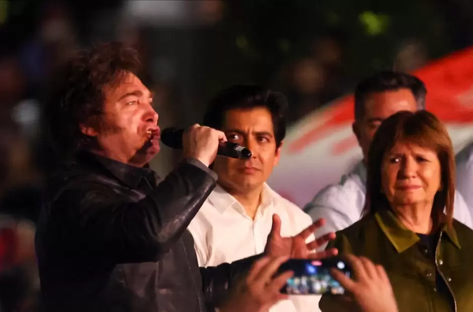 Sobre el escenario acompañaron al mandatario, el primer candidato a diputado nacional por Córdoba de LLA, Gonzalo Roca, Karina Milei, Patricia Bullrich, Martín Menem y Manuel Adorni.