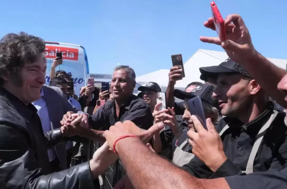 El Presidente llegó a la muestra de San Nicolás acompañado por Karina Milei, Guillermo Francos, Fernando Vilella y los diputados nacionales José Luis Espert y Romina Diez.