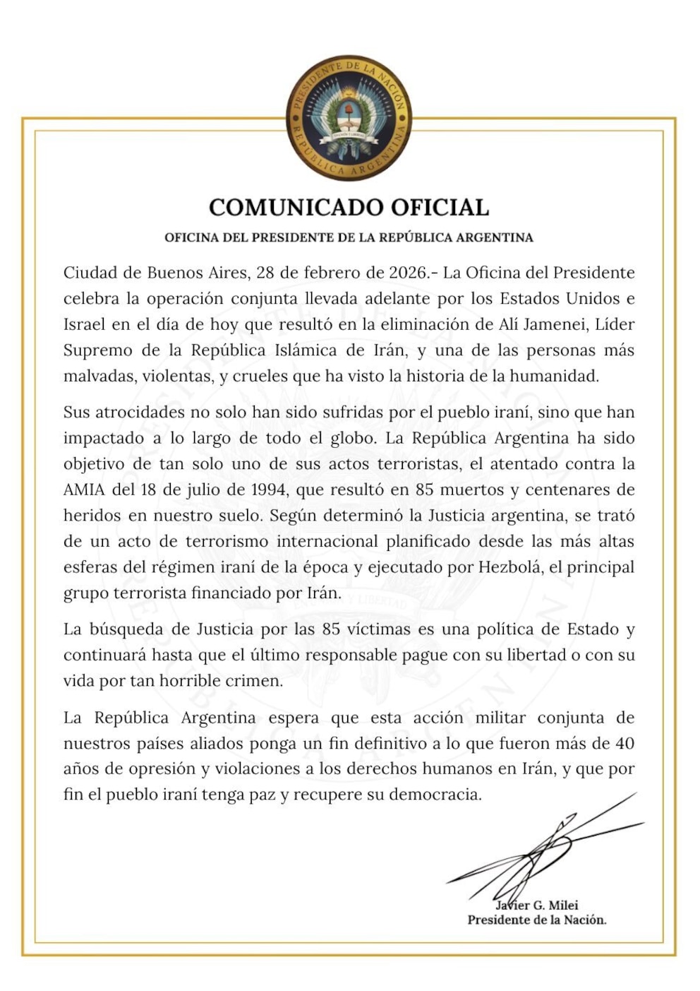 El Gobierno nacional manifestó un contundente apoyo a la operación conjunta llevada adelante por Estados Unidos e Israel frente a Irán, celebró la eliminación de Ali Khamenei y ratificó que continuará la búsqueda de justicia por las víctimas del atentado a la AMIA. En un comunicado oficial, el presidente Javier Milei fijó una posición categórica y vinculó el hecho con más de 40 años de opresión y violaciones a los derechos humanos en territorio iraní.