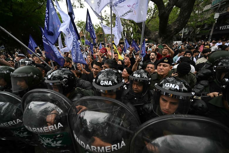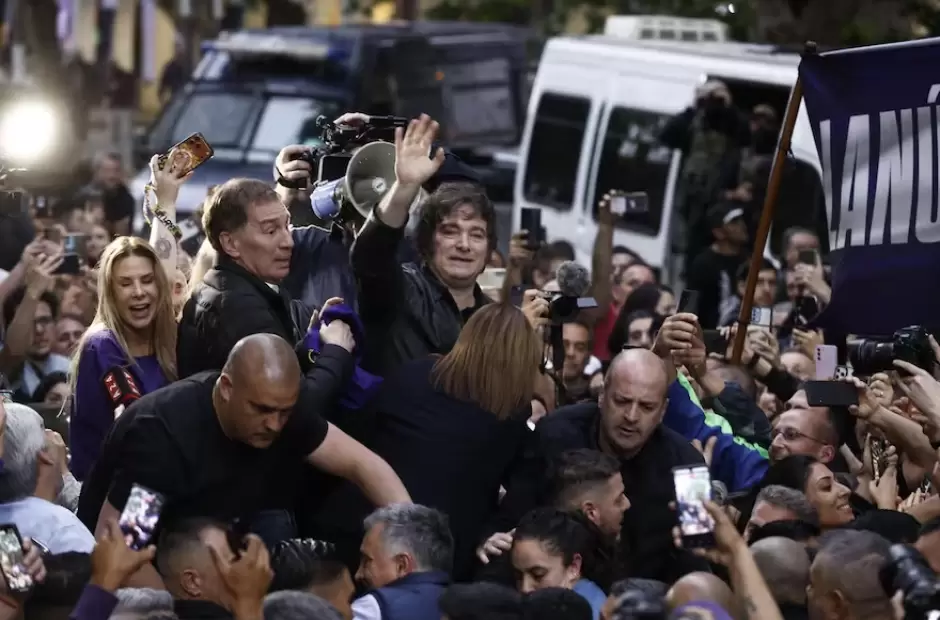 Antes de la llegada de Milei y sus candidatos, hubo algunos empujones y corridas entre los militantes libertarios y un reducido grupo de manifestantes que concurrieron a las inmediaciones de la céntrica Plaza de los Aviadores a protestar contra el Presidente, pero la situación no pasó a mayores.