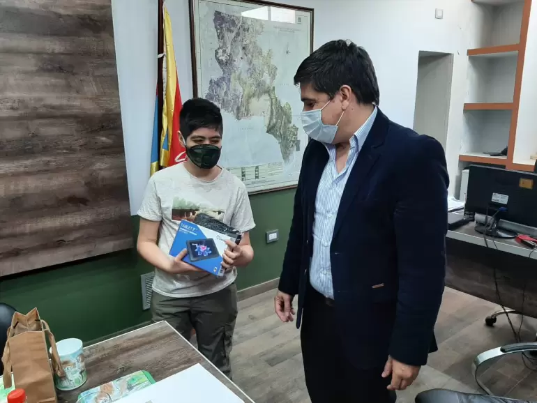 En la oportunidad el funcionario ambiental le entregó una Tablet a Luca para que continúe sumando conocimiento e instruyéndose en todo lo que desee para continuar expresando en sus cuentos para los próximos concursos. Luca por su parte también le obsequió al Soberón un porta lápices con la estampa de dibujos que estaban acompañados del cuento ganador del concurso literario.