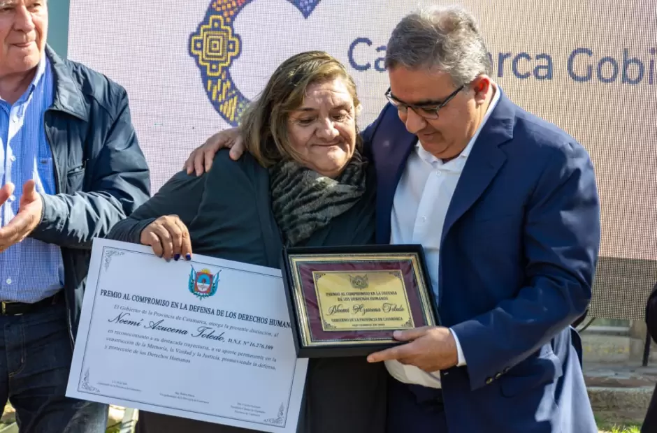 Este jueves en un acto realizado en Casa de Gobierno, Noemí Toledo, presidenta de la Casa de la Memoria, recibió el reconocimiento al “Compromiso en la defensa de los Derechos Humanos". La distinción fue entregada por el gobernador Raúl Jalil junto al Vicegobernador Rubén Dusso y el ministro de Gobierno, Justicia y Derechos Humanos, Juan Cruz Miranda.