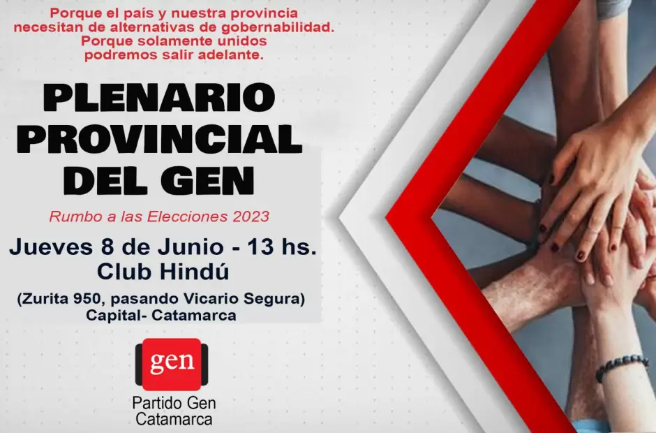 El partido GEN, cuya referente nacional es una Margarita Stolbizer y en la provincia representan el diputado mandato cumplido Alfredo Gómez, como presidente y la Dra. Beatriz Monllau como vicepresidenta, realizará el jueves 8 de junio un plenario provincial, para definir las acciones en miras a las próximas elecciones generales.