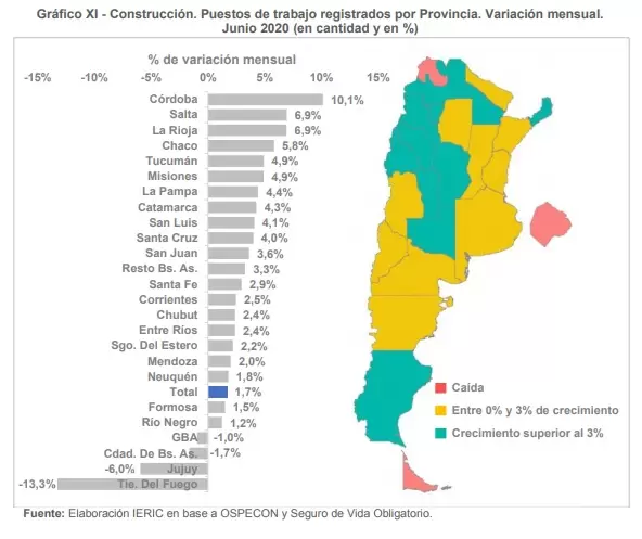 Esta leve recuperación o repunte de los empleos registrados en la construcción se repitió con diferentes matices, en la mayoría de las provincias, con la sola excepción de Tierra del Fuego, Jujuy, Ciudad de Buenos Aires y, en el caso de la Provincia de Buenos Aires, en el área denominada Gran Buenos Aires.