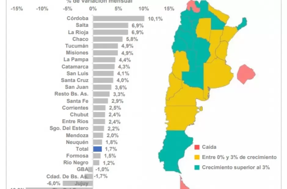 En cuanto a la venta de cemento, La Rioja y Catamarca volvieron a ser las jurisdicciones con mayor tasa de crecimiento, por arriba del 20 %.