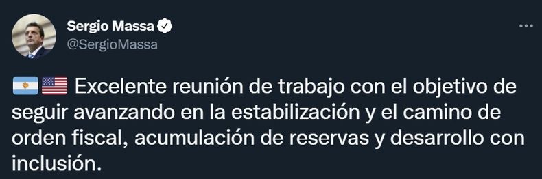 "Excelente reunión de trabajo con el objetivo de seguir avanzando en la estabilización y el camino de orden fiscal, acumulación de reservas y desarrollo con inclusión", remarcó Massa sobre el encuentro con la economista búlgara a través de una publicación en Twitter.