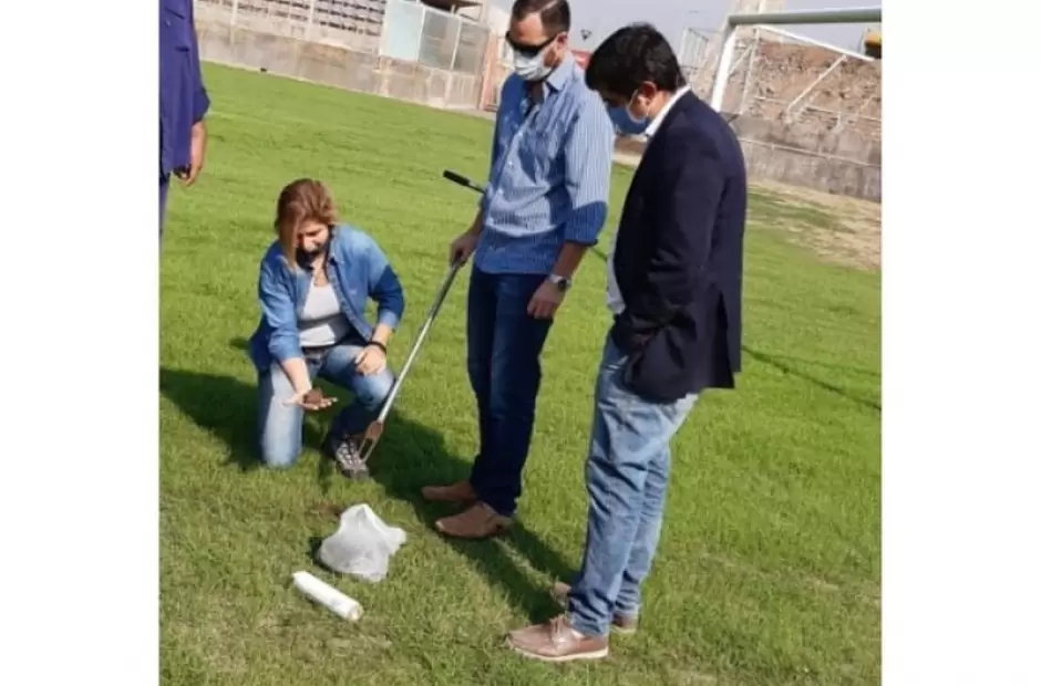 Los mismos, realizaron extracciones de muestra de agua y suelo del campo de juego del Estadio Provincial Bicentenario, para analizar y determinarán los valores de propiedades químicas como el Ph salinidad y NPK (macro nutrientes).