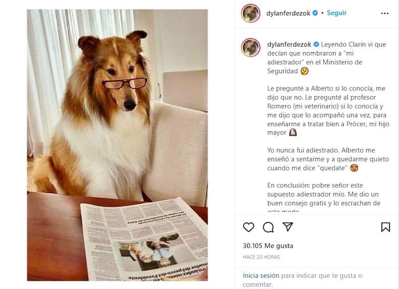 A través del perfil de la mascota, Fernández publicó una foto de Dylan con anteojos puestos mientras leía un ejemplar del diario Clarín. "Leyendo Clarín vi que decían que nombraron a 'mi adiestrador' en el Ministerio de Seguridad. Le pregunté a Alberto si lo conocía, me dijo que no", aseguró.