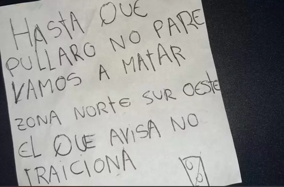 El mensaje, que ilustra esta nota, dice: “Hasta que Pullaro no pare vamos a matar. Zona norte sur oeste. El que avisa no traiciona”. Debajo, se encuentra un diagrama, que parece ser una ficha de dominó tachada, con dos círculos.