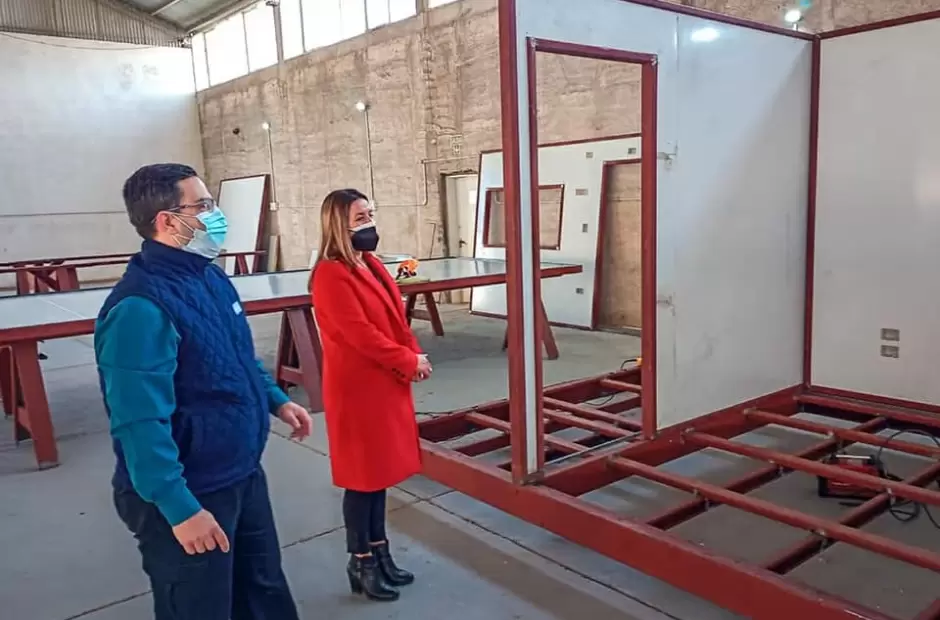 La jefa comunal, junto a funcionarios del municipio, recorrió la línea de fabricación y ensamble de los diferentes módulos, además de recibir información sobre las posibilidades de producción de módulos habitacionales realizados con el mismo sistema constructivo de paneles de poliuretano expandido sobre marcos de perfiles de acero de alta resistencia.