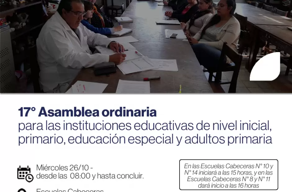 El Ministerio de Educación a través de la Secretaría de Gestión Educativa comunica que por Resolución SGE (ME) N° 121/2022 se autoriza a la realización de la 17° Asamblea ordinaria de opción para la cobertura de cargos interinos y/o suplentes para las instituciones educativas de los niveles inicial, primario, educación especial y adultos primaria de gestión estatal pública, a llevarse a cabo el día miércoles 26 de octubre del corriente año en las escuelas cabeceras departamentales habilitadas, a partir de las 08:00 horas.