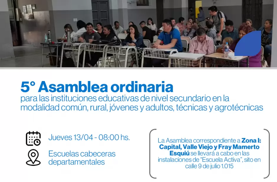 La Asamblea correspondiente a Zona I: Capital, Valle Viejo y Fray Mamerto Esquiú se llevará a cabo en las instalaciones de “Escuela Activa”, sito en calle 9 de julio 1.015 (esquina Mate de Luna) de San Fernando del Valle de Catamarca, según el siguiente cronograma de llamado: