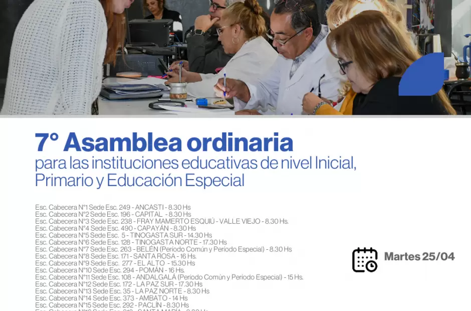 El Ministerio de Educación a través de la Secretaría de Gestión Educativa comunicó que por Resolución SGE (ME) N°38/2023 se autoriza a la realización de la 7° Asamblea ordinaria de opción para la cobertura de cargos interinos y/o suplentes para las instituciones educativas de nivel Inicial, Primario y Educación Especial, de gestión estatal pública. La misma se llevará a cabo el día martes 25 de abril de 2023 en las Escuelas Cabeceras departamentales habilitadas según el siguiente cronograma:
