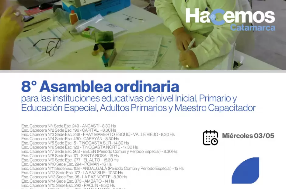 El Ministerio de Educación a través de la Secretaría de Gestión Educativa comunica que por Resolución SGE (ME) N°38/2023 se autoriza a la realización de la 8° Asamblea ordinaria de opción para la cobertura de cargos interinos y/o suplentes y cargos de maestro capacitador (los docentes convocados son los inscriptos en el Área 29: Formación Profesional – Capacitadores Laborales y clasificados en el LOM 2023) para las instituciones educativas de nivel Inicial, Primario, Educación Especial y Adultos Primarios de gestión estatal pública, a llevarse a cabo el día miércoles 3 de mayo de 2023 en las Escuelas Cabeceras departamentales habilitadas según el siguiente cronograma: