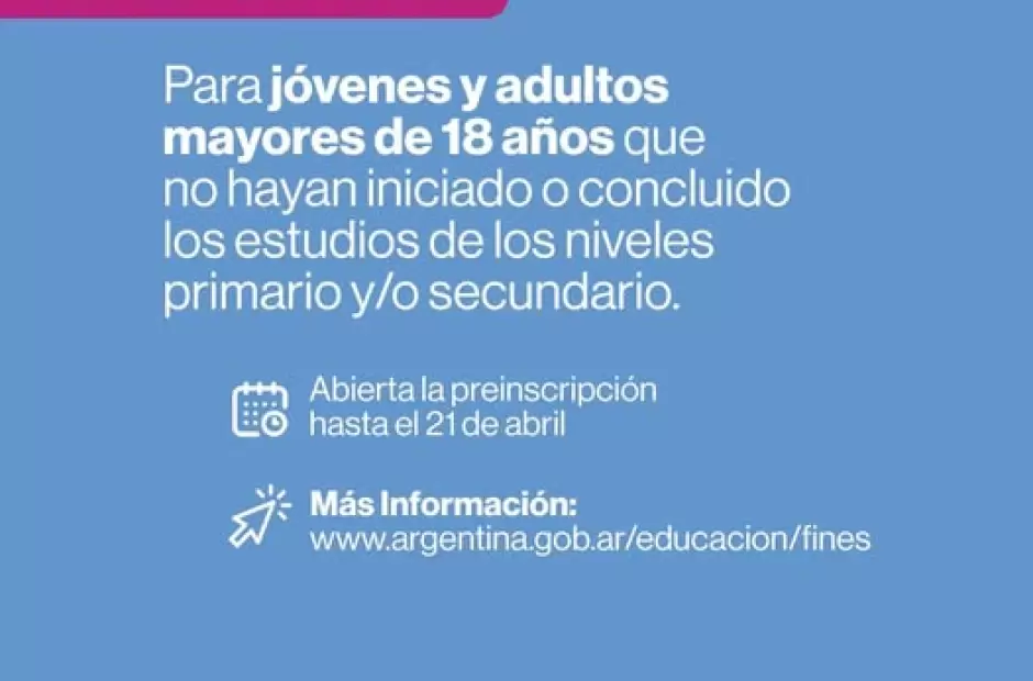 A través de la Dirección de Programas Educativos, la cartera educativa informó que se encuentra abierta hasta el lunes 21 de abril, la preinscripción para el Plan FinEs 2025 destinado a personas mayores de 18 años que no hayan iniciado o concluido los estudios de los niveles primario y/o secundario.