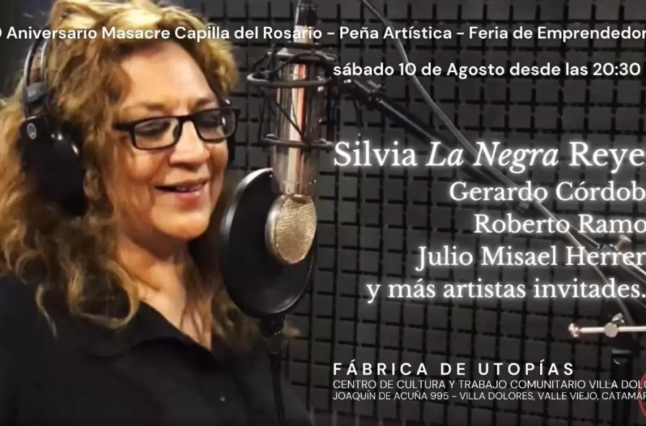 Este sábado 10 de agosto desde las 19 hs. se realizarán presentaciones, muestras. feria de emprendedoras y una peña, como parte de los actos programados para conmemorar el 50° Aniversario de la Masacre de Capilla del Rosario. La actividad tendrá lugar en el Centro de Cultura y Trabajo Comunitario Villa Dolores, calle Joaquín de Acuña 995, Valle Viejo.