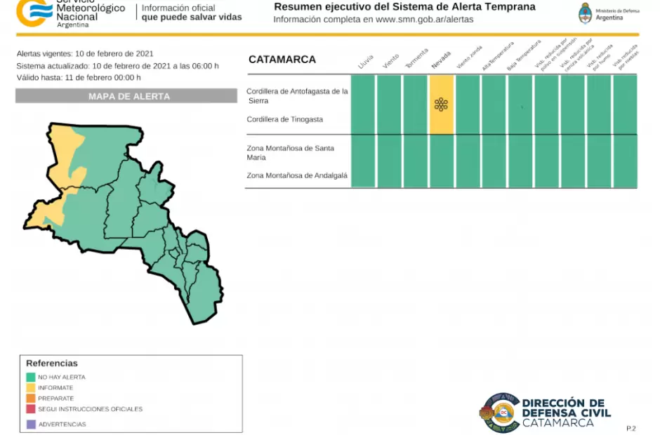 El Sistema de Alerta Temprana del Servicio Meteorológico Nacional emitió una Alerta Amarilla por nevadas vigente para hoy miércoles. La misma afecta a la Cordillera de Antofagasta de la Sierra y la de Tinogasta.