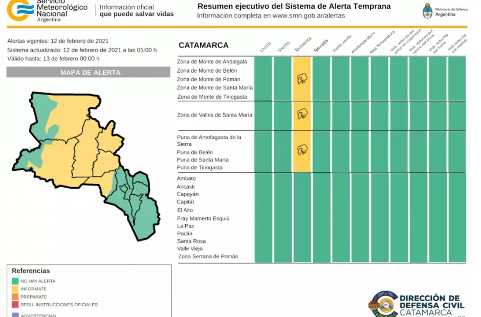 El Sistema de Alerta Temprana del Servicio Meteorológico Nacional emitió una alerta amarilla por tormentas vigente para hoy viernes afectando las zonas de Santa María, Andalgalá, Belén, Pomán, Antofagasta de la Sierra y Tinogasta.