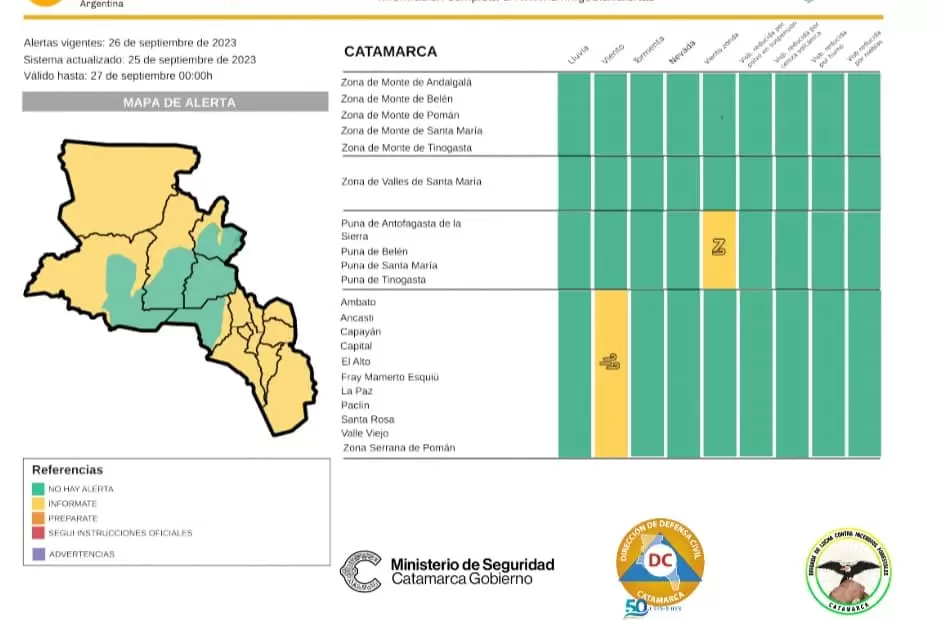 El fenómeno meteorológico rige para Ambato, Ancasti, Capayán, Capital, El Alto, Fray Mamerto Esquiú, La Paz, Paclín, Santa Rosa, Valle Viejo y la Zona serrana de Pomán. También se verán afectadas las localidades de Tinogasta, Antofagasta de la Sierra, Belén y Santa María.