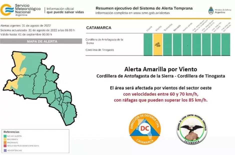 El fenómeno estará afectando la zona Cordillerana del departamento Antofagasta de las Sierras y Tinogasta. Con una velocidad aproximada de los vientos entre 60 y 70 kilómetros por hora.