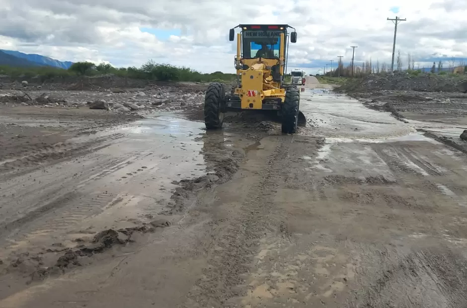 Se solicita precaución en el cruce de badenes entre Las Abritas y Santa María, debido al paso de agua y acumulación de material de arrastre sobre la calzada. Personal y equipos trabajan en el despeje.