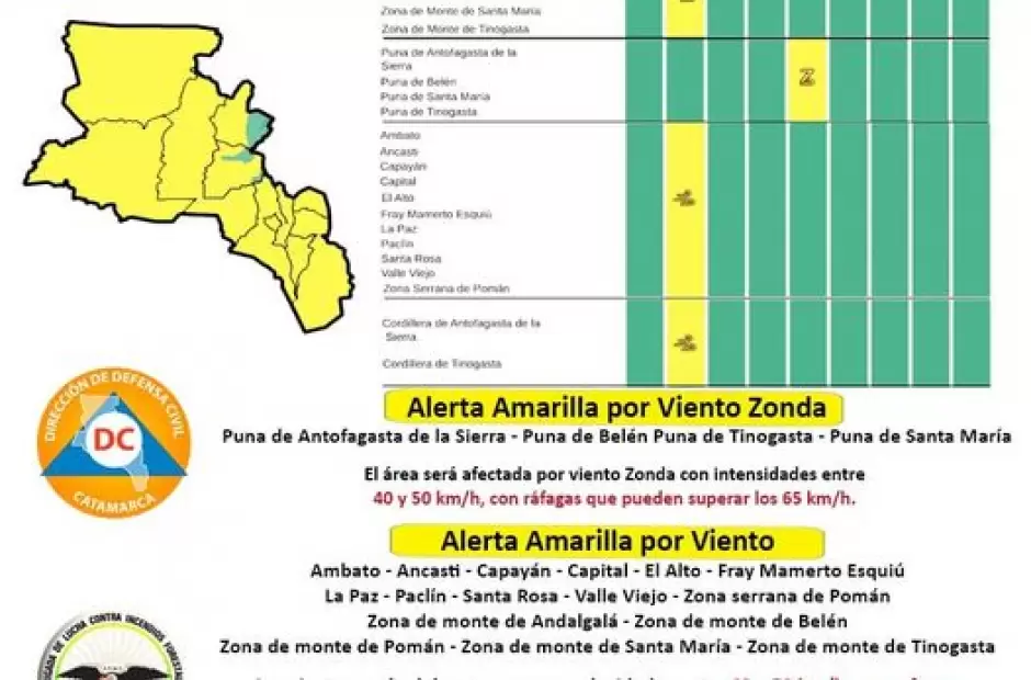 A esto se debe sumar que para la Puna de Antofagasta de la Sierra, Belén, Tinogasta y Santa María se anuncian vientos zonda. El área será afectada por viento con intensidades que oscilarán entre los 40 y 50 km/h, mientras que las ráfagas podrán superar los 65 km/h. Este fenómeno puede provocar reducción de la visibilidad, un repentino aumento de temperaturas y condiciones muy secas, indicaron desde el SMN.