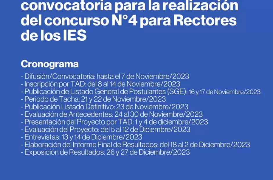 El cronograma para el presente Concurso de Rectorías del Nivel Superior de la Provincia de Catamarca quedará definido de la siguiente manera: