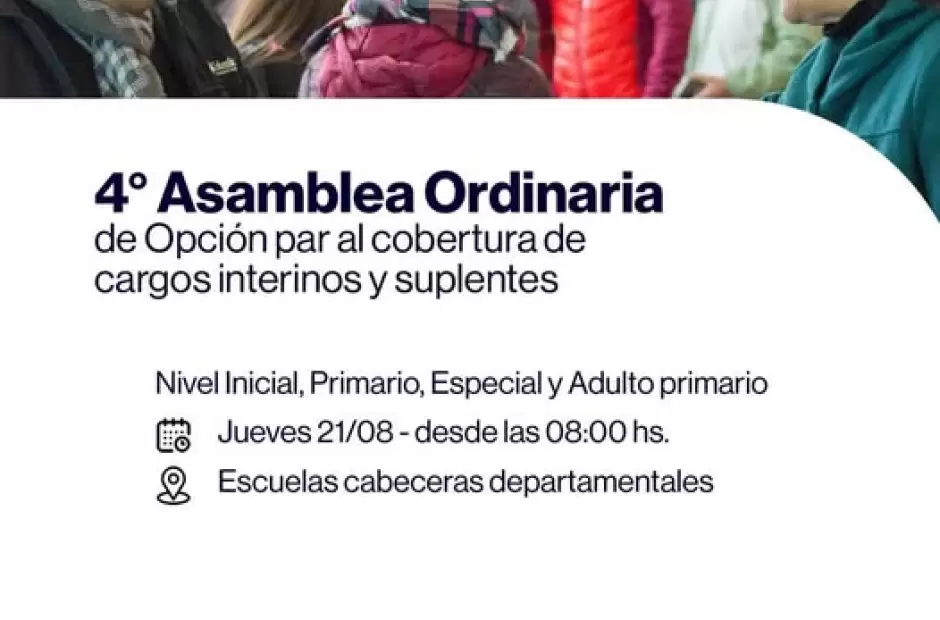 La asamblea se llevará a cabo el jueves 21 de agosto en las Escuelas cabeceras departamentales habilitadas en toda la provincia. En el encuentro, los educadores podrán optar por los cargos disponibles para el ciclo lectivo en curso.