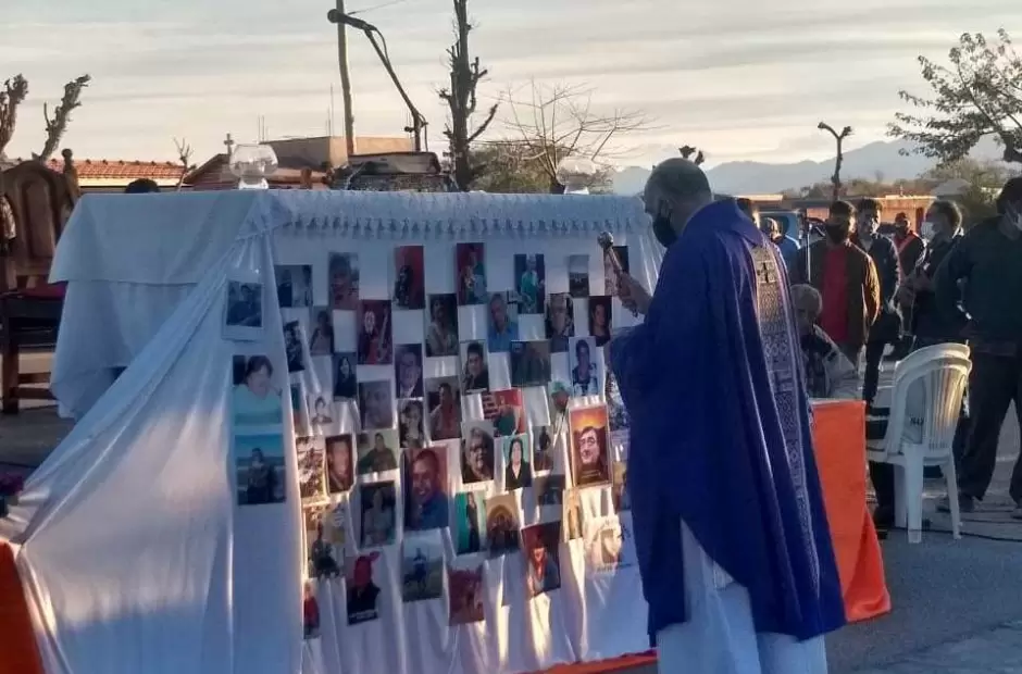 El pasado viernes 23 de julio, se celebró la Santa Misa, presidida por el párroco, Pbro. Javier Grosso, en el ingreso al cementerio de la Ciudad de Belén. En este lugar se levantó el altar, alrededor del cual se colocaron imágenes con los rostros de algunas de las personas que murieron a raíz de esta enfermedad.