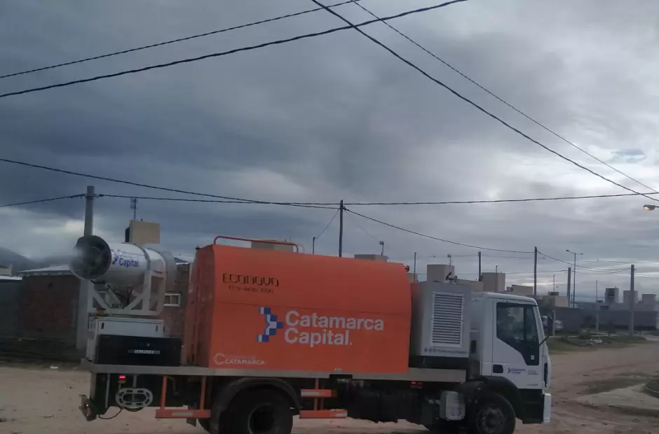 Desde horas tempranas el camión sanitizante de la municipalidad de la Capital recorre las calles del barrio.