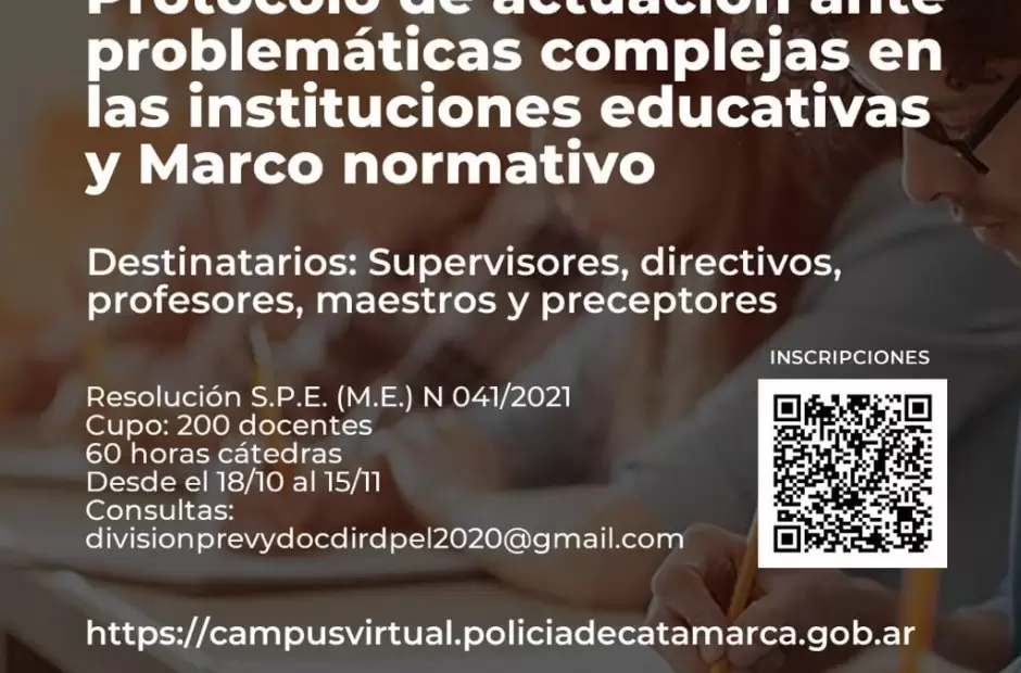 La capacitación, destinada a supervisores, directivos, profesores, maestros y preceptores de instituciones educativas de la provincia, se desarrollará desde el 18 de octubre hasta el 15 de noviembre del corriente y cuenta con una carga horaria de 60 horas cátedra y evaluación final.