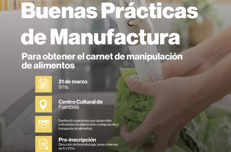 El Ministerio de Salud de la provincia, a través de la Dirección de Calidad Alimentaria, continúa brindando capacitaciones para la obtención del carné de Manipulador/a de Alimentos. En esta oportunidad, se llevará a cabo el curso de Buenas Prácticas de Manufactura en la localidad de Fiambalá, el día jueves 21 de marzo a las 9 horas en el Centro Cultural. Organizado de forma conjunta con la Municipalidad de Fiambalá, la pre-inscripción se realiza en la Dirección de Bromatología de 8 a 13 horas.