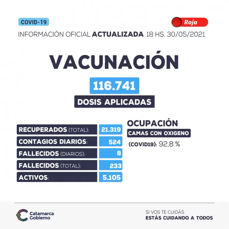 En cuanto al avance de la campaña de vacunación para COVID-19 en Catamarca, el Ministerio de Salud detalla que hasta el día 30 de mayo se aplicaron 116.741 dosis y que las mismas fueron aplicadas a un total de 86.598 personas (Fuente: NOMIVAC).