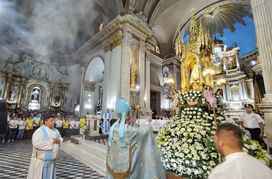 Animados por el lema "Peregrinos de esperanza", en horas de la tarde se llevó a cabo la tradicional Bajada de la Imagen cuatro veces centenaria desde el Camarín hasta el Presbiterio, que fue llevada en brazos por el obispo diocesano, Mons. Luis Urbanč, acompañado por sacerdotes del clero catamarqueño, entre ellos el vicario general, padre Julio Murúa, y el rector del Santuario Catedral, padre Juan Ramón Cabrera.
