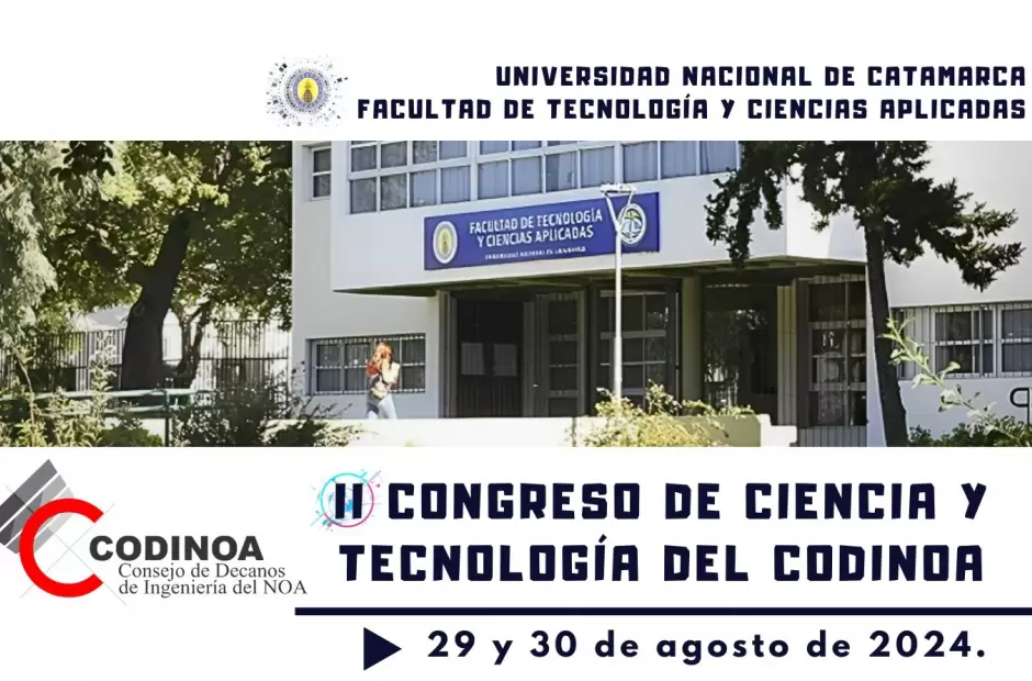 El 29 y 30 de agosto, con el lema "Ciencia, Tecnología e Ingeniería: pilares para el desarrollo regional", se realizará en Catamarca el II° Congreso de Ciencia y Tecnología del Consorcio de Decanos de Ingeniería del NOA (CODINOA), con la Facultad de Tecnología y Ciencias Aplicadas de la Universidad Nacional de Catamarca(UNCA) como sede del programa de actividades.