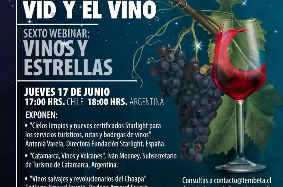 Se trata del Ciclo de Talleres Webinars “LOS VIAJES DE LA VID Y EL VINO”, en su sexta edición denominada “Vinos y Estrellas” que se desarrollará hoy Jueves 17 de junio, desde las 18 horas de la Argentina, donde expondrán la Directora de la Fundación Starlight de España, Antonia Varela, sobre, “Cielos limpios y nuevos certificados Starlight para los servicios turísticos, rutas y bodegas de vinos”.