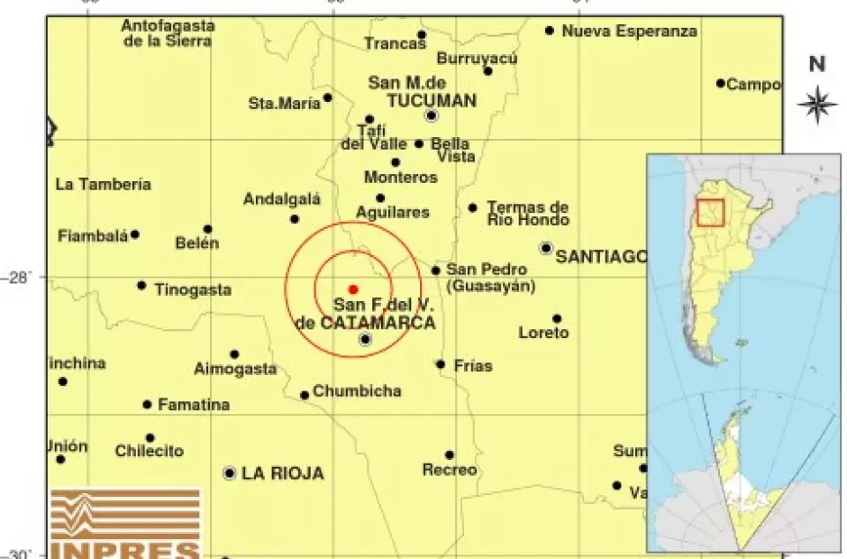El INPRES (Instituto Nacional de Prevención Sísmica) informó luego que el epicentro se ubicó a 41 Km al Norte de la ciudad de San Fernando del Valle de Catamarca; a 154 Km al Suroeste de San Miguel de Tucumán y a 69 Km al Oeste de San Pedro.