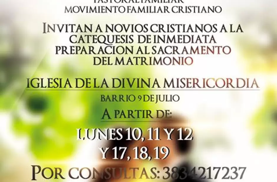 La Pastoral Familiar y el Movimiento Familiar Cristiano invitan a novios a participar de catequesis de inmediata preparación al Sacramento del Matrimonio. La misma tendrá lugar del 10 al 12 y del 17 al 19 de agosto, en la Iglesia de la Divina Misericordia, ubicada en el barrio 9 de Julio, ciudad capital.
