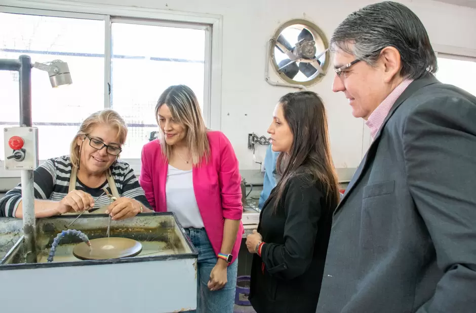 En su recorrido, que estuvo acompañado por la directora de la Escuela, Salomé Mendez y el director de Educación Técnica y Formación Profesional, Miguel Sandoval, Centurión visitó cada uno de los talleres empezando por el de “Lapidación”, donde fue recibida por el instructor Eduardo González y los alumnos/as, quienes le expresaron las necesidades y proyecciones del taller. Luego siguió su visita por el taller de “Joyería” donde la recibieron las instructoras Isabel Zotelo y Johana Acosta junto con los alumnos/as, quienes les mostraron sus trabajos y conversaron sobre pequeños insumos que se necesitan para el día a día