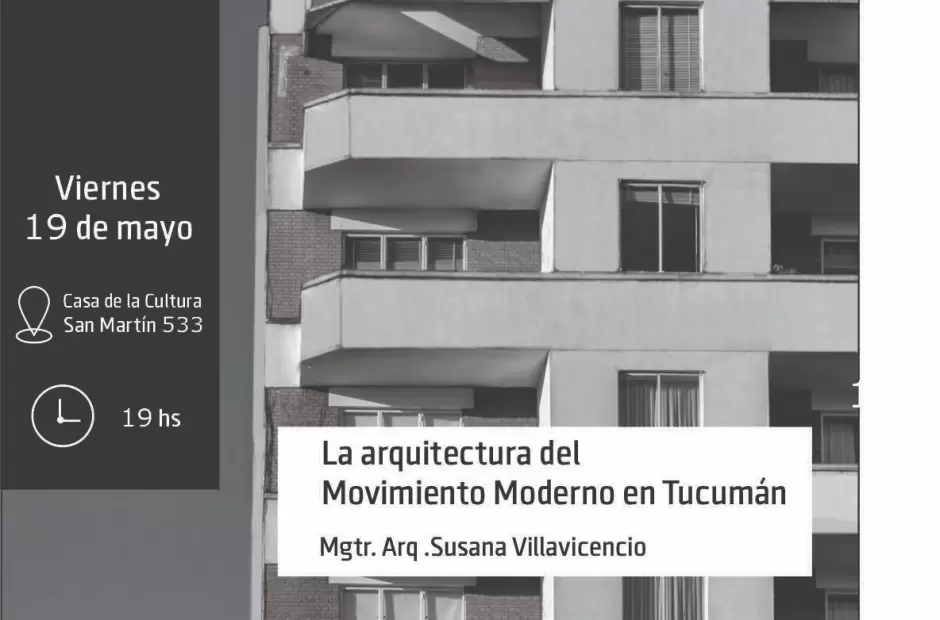 El encuentro será en la Casa de la Cultura, San Martín 533, a las 19 horas, y en esta oportunidad, el tema de la charla será "La arquitectura del Movimiento Moderno en Tucumán. Obras y protagonistas de una nueva arquitectura". La charla estará a cargo de la arquitecta Susana Villavicencio, Magíster en Historia de la Arquitectura y el Urbanismo Latinoamericano por la Facultad de Arquitectura y Urbanismo de la Universidad Nacional de Tucumán y Doctoranda en el Doctorado en Arquitectura de la FAU UNT.
