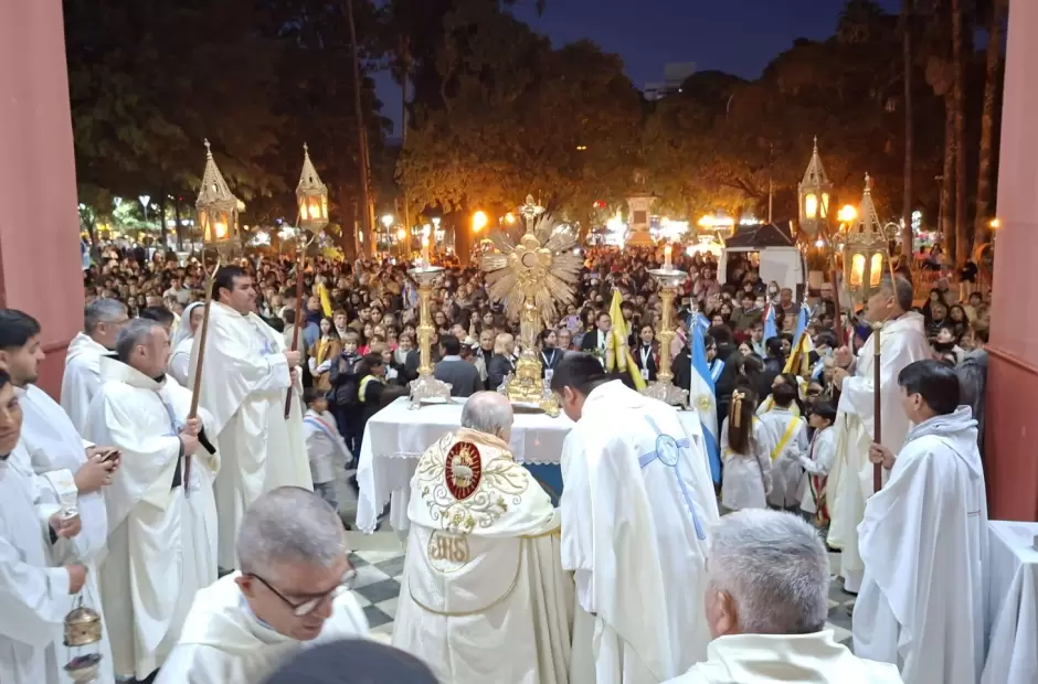Finalizada la misa, los fieles acompañaron la tradicional procesión con el Santísimo Sacramento alrededor de la plaza 25 de Mayo. Encabezaban el cortejo los abanderados de instituciones educativas, sacerdotes portando la Custodia y una multitud que elevó cánticos y oraciones.